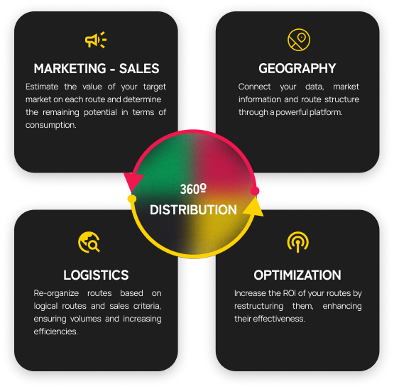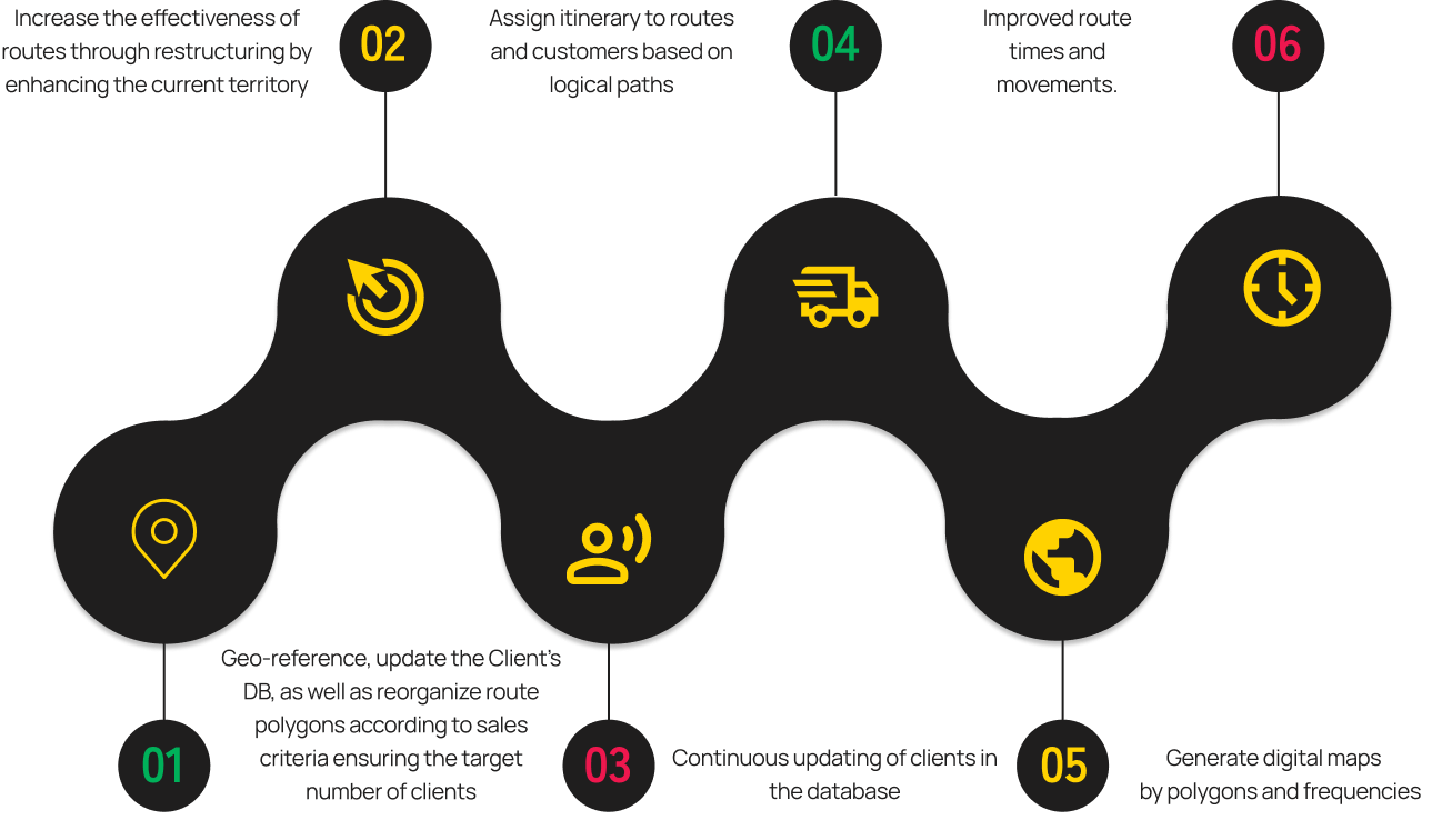 Full use of the route within the territory and feasibility analysis (restructuring, route balancing, route optimization, route monitoring, downtime, etc.)